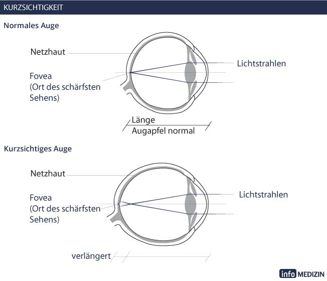Bei einer Kurzsichtigkeit (Myopie) ist der Augapfel häufig zu lang, sodass einfallende Lichtstrahlen auf der Netzhaut nicht punktförmig gebündelt werden können. Die Folge ist eine Sehschwäche, bei der Betroffene ihre Umgebung in der Ferne nur unscharf wahrnehmen können.